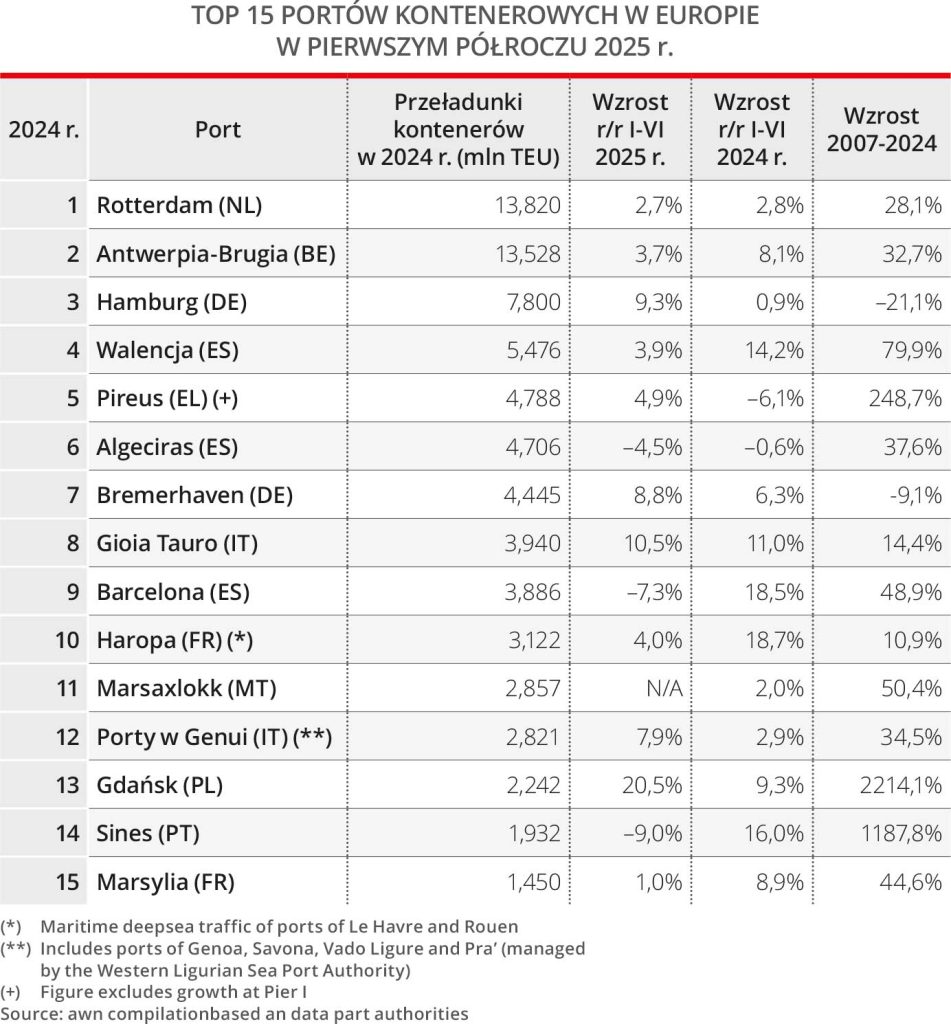 Liderem, jeśli chodzi o obroty kontenerowe w UE, pozostaje Rotterdam z wolumenem 13,8 mln TEU w 2024 r. i wzrostem o 2,7% w I półroczu br. Tuż zanim plasuje się Antwerpia-Brugia z wynikiem 13,5 mln TEU za 2024 r. i wzrostem o 3,7% w I półroczu 2025 r. Trzecie miejsce niezmiennie zajmuje Hamburg, który w zeszłym roku przeładował 7,8 mln TEU, a w I półroczu br. odnotował wzrost o 9,3%. Z wynikiem 2,24 mln TEU Port Gdańsk plasuje się na 13. miejscu w UE.